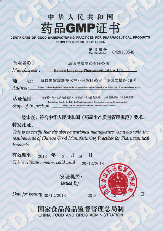 圖為海南靈康制藥有限公司本次認(rèn)證獲得的新版GMP認(rèn)證證書,該證書有效期為五年
