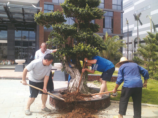 圖為公司員工正在扶正被臺風(fēng)吹倒的樹木