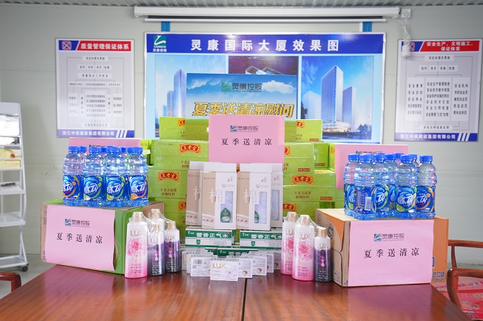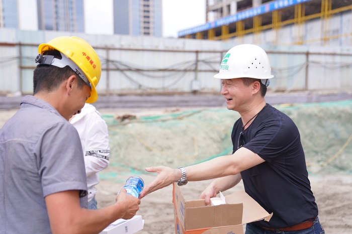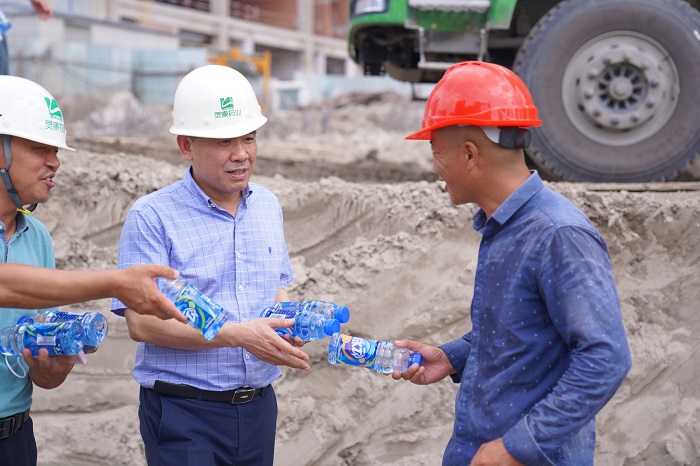 入伏以來、連日高溫,靈康國際大廈項(xiàng)目施工現(xiàn)場溫度一度升至40攝氏度以上。集團(tuán)董事長陶靈萍時(shí)刻牽掛奮戰(zhàn)在項(xiàng)目建設(shè)一線的員工及建筑工人,對(duì)高溫條件下項(xiàng)目施工進(jìn)展情況提出明確要求,并專門安排了一線慰問送清涼活動(dòng)。7月26日下午,靈康控股集團(tuán)副總裁蔣建中、副總裁楊棟、總工程師陶祿緣等,來到項(xiàng)目施工現(xiàn)場,慰問一線工作人員。