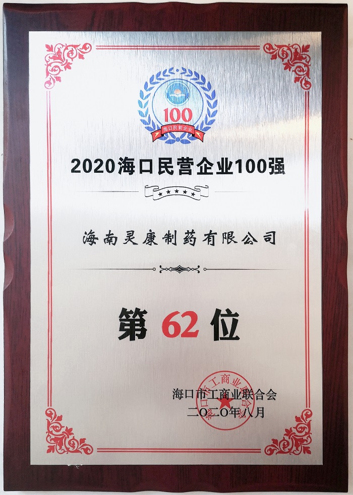 海南靈康制藥有限公司榮獲“2020年??谑忻駹I企業(yè)100強”稱號