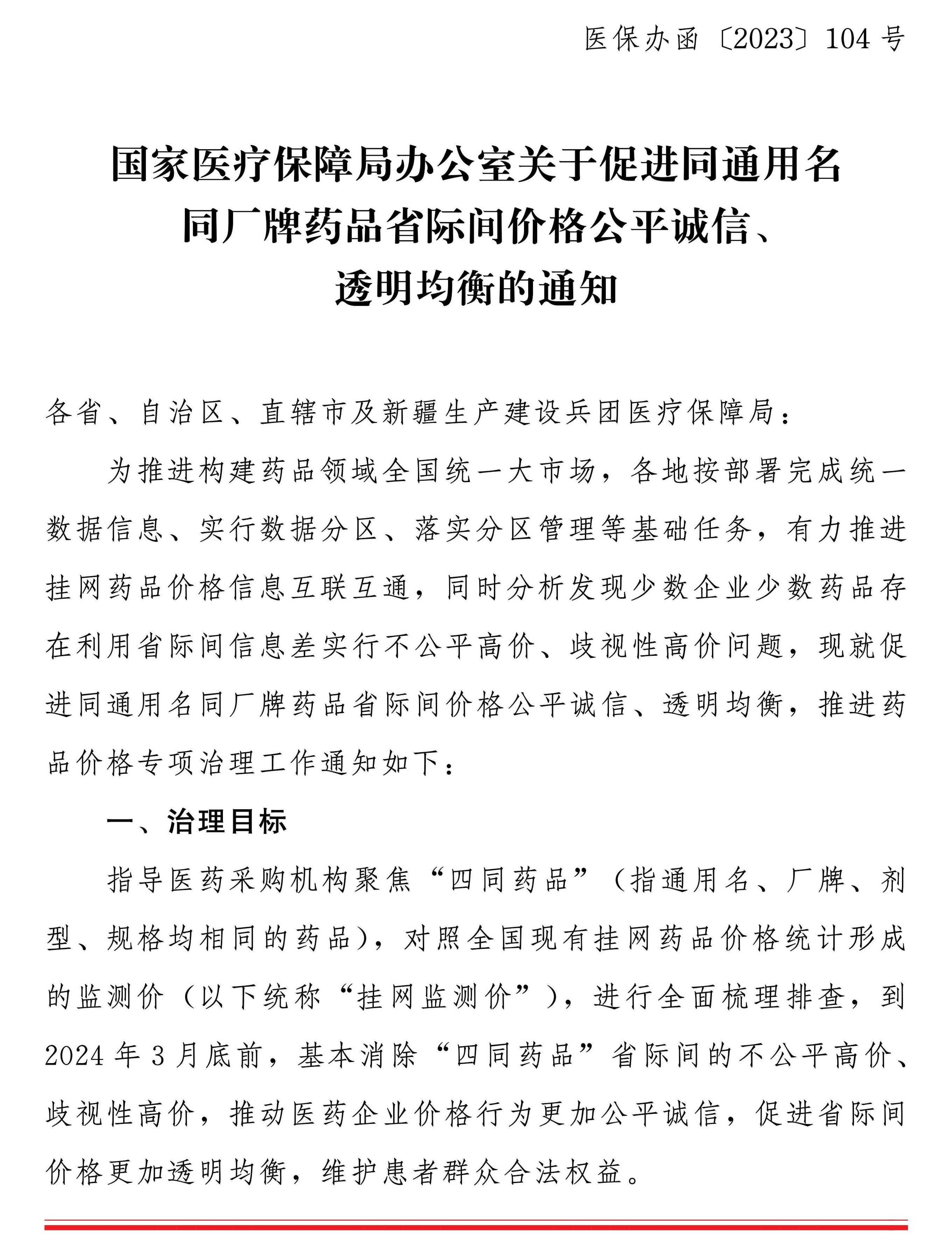 國(guó)家醫(yī)療保障局辦公室關(guān)于促進(jìn)同通用名同廠牌藥品省際間價(jià)格公平誠(chéng)信、透明均衡的通知