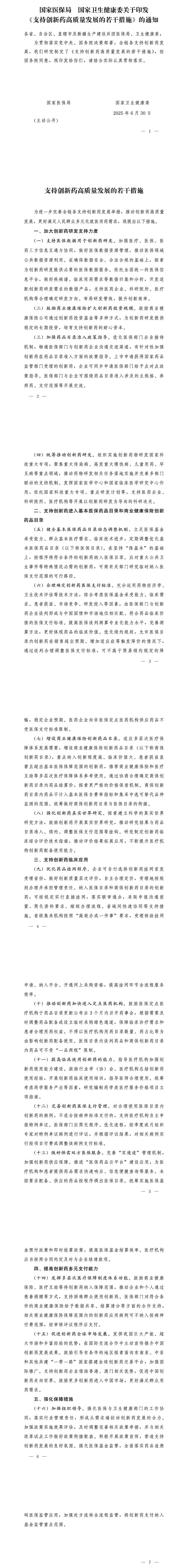 國家醫(yī)保局 國家衛(wèi)生健康委關(guān)于印發(fā)《支持創(chuàng)新藥高質(zhì)量發(fā)展的若干措施》的通知